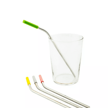 Coffret de 4 pailles coudées en inox. Idéal pour une soirée entre amis avec leur embout coloré en silicone.